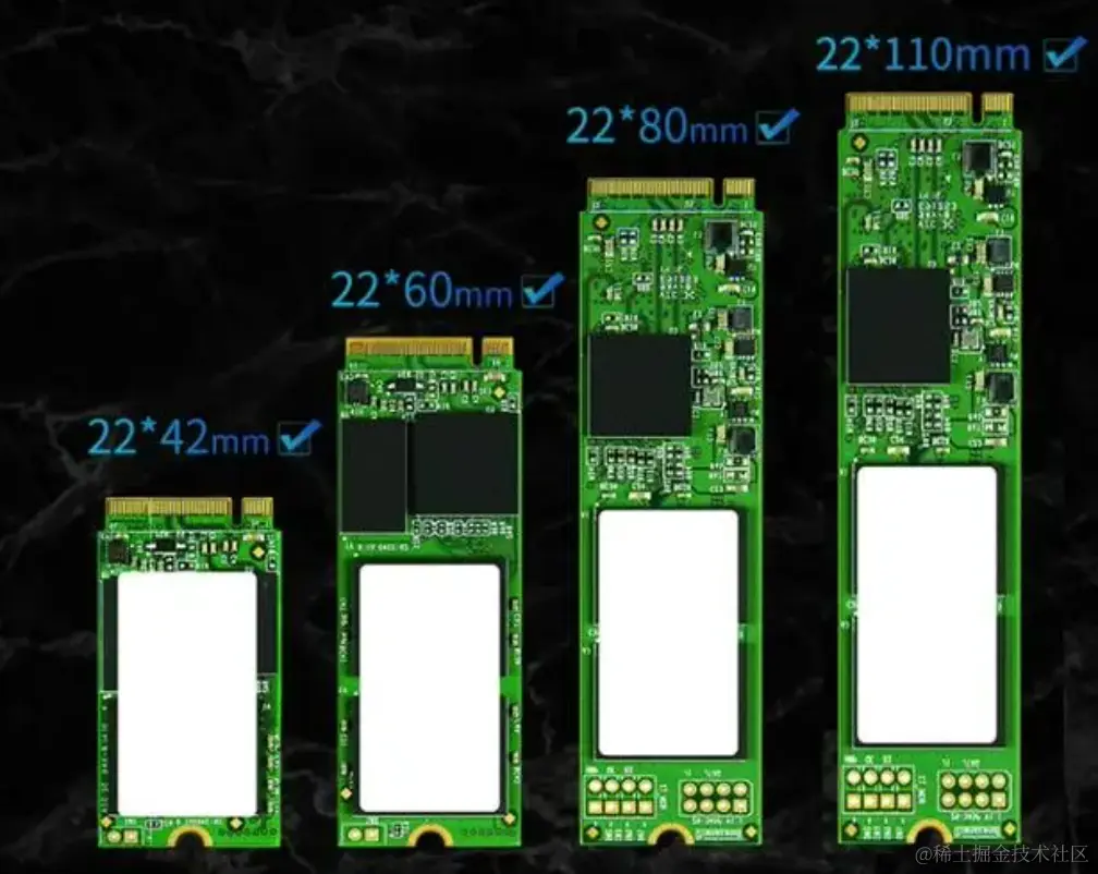 对于M.2接口的硬盘,如上图,其标签纸上的2280代表这个固态硬盘的尺寸,除了2280之外,主流的还有:2260、2242以及22110等