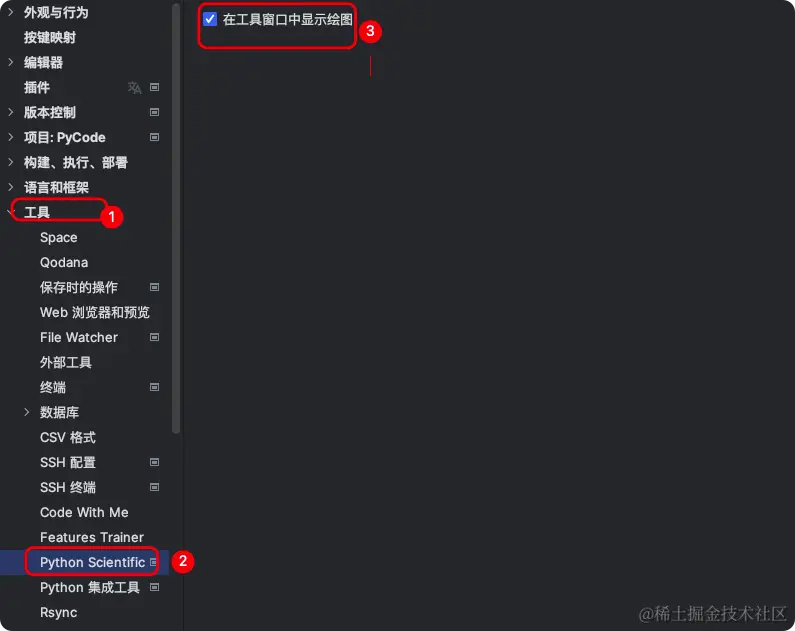 如何让matplotlib在pycharm里面绘制的图像自动拖动 yundem 2024-01-18 287 阅读1分钟 想必刚开始学习matplotlib的同学肯定会遇到跟我一样的问题、就是绘制3d图形的时候无法自动拖拽、直观观看这个图像 这个时候大家如果想自由拖拽需要怎么做呢? 其实很简单 1、打开pycharm,“文件—>设置”,打开设置窗口 2、找到 “tools 工具”; 3、找到“Python Scientific”,然后,去除右边Show plots in toolwindow候选框中的勾号。 之后再运行下程序就可以了 是不是很简单 如果解决了问题、记得一键三连、谢谢