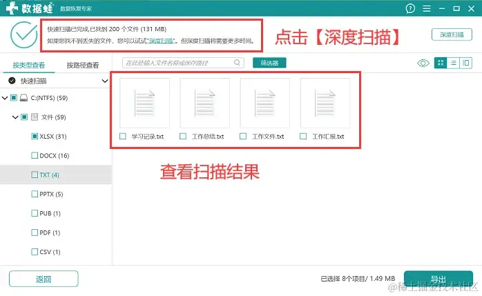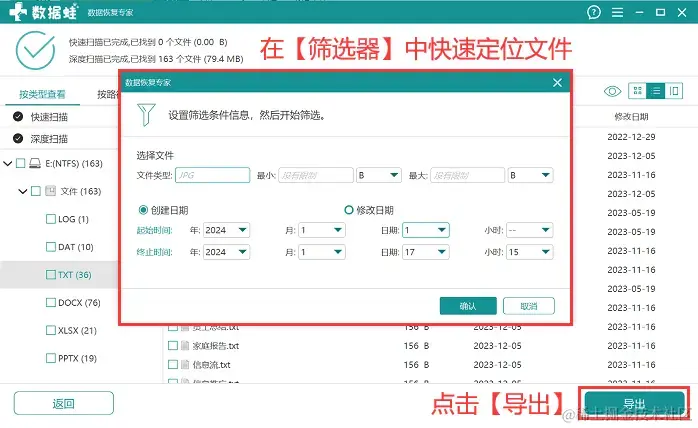 第3步:等待深度扫描完成后,用户可以上下滑动勾选文件,也可以在【筛选器】 中勾选文件,完成勾选后,点击【导出】 ,并选择另一磁盘作为保存位置。