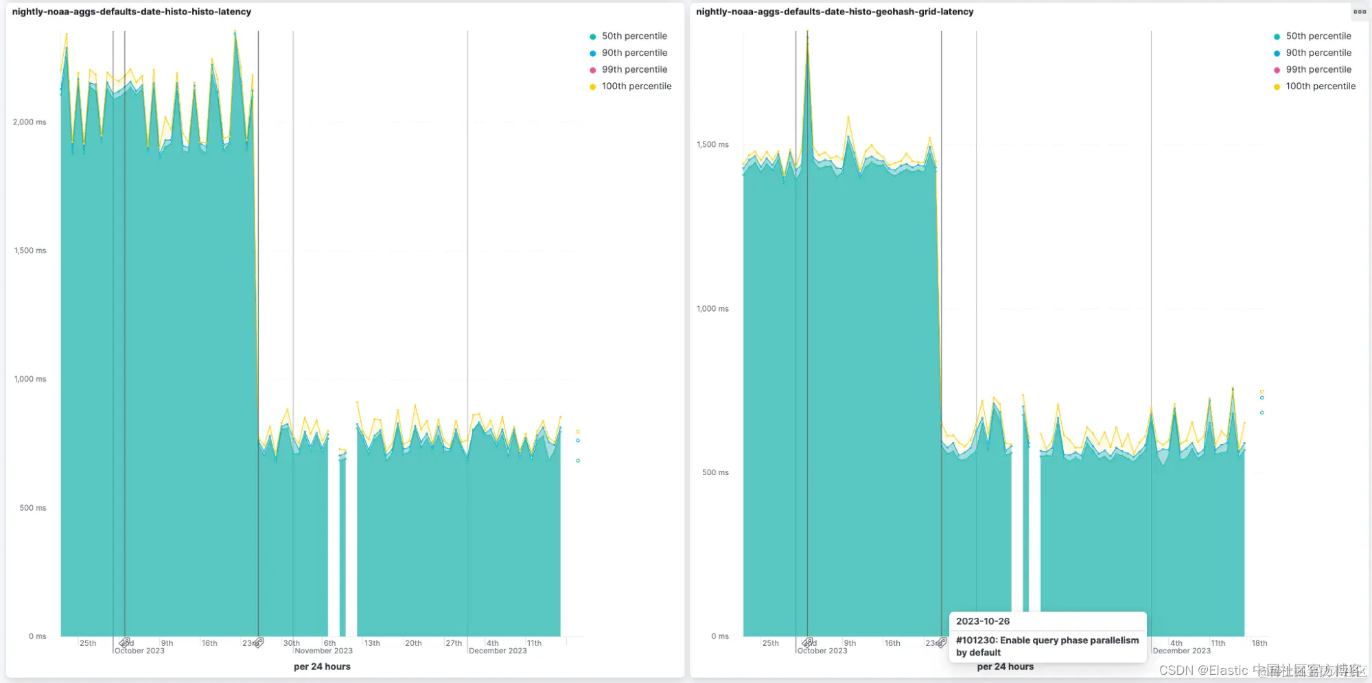 在 8.10 中,我们为向量搜索添加了查询并行化,这在适当的条件下显着改善了查询延迟。 我们现在为大多数其他查询和聚合添加类似的并行化。 有一些例外,最值得注意的是术语聚合(因为增加术语聚合的并行化会对它们的准确性产生负面影响)。 对聚合的影响尤其显着,有时会将延迟减少到以前的一半以下。 如果有可用线程,新的并行化机制将为每个查询的每个段(segment)分配最多一个线程,并限制每个查询分配的最大线程数。 你可以在我们的公开夜间基准测试中见证结果。