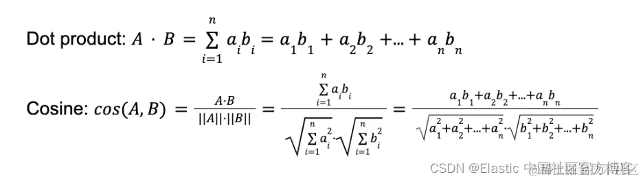 在 Elasticsearch中,我们支持四种向量相似度方法(欧几里得、曼哈顿、余弦和点积),但在实践中,大多数模型输出的向量应该通过余弦相似度进行比较。 我们一直建议用户使用点积而不是余弦,但为了做到这一点,用户必须对 ML 模型在推理时生成的向量进行归一化(即,将它们除以范数,使其长度变为 1)。 当向量被归一化时,它们按照归一化查询向量的点积的排序顺序将与它们在归一化之前按照余弦的排序顺序相同。 我们建议使用点积的原因是它在查询时需要更少的操作,从而允许更好的查询延迟。 如果你检查点积和余弦的运算,一切都会变得清晰: