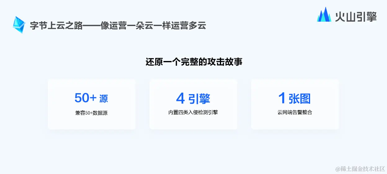 在风险检测方面, 内置4类入侵检测引擎,全面保护云上资产。火山引擎兼容不同云产品和安全产品。通过可视化形式,帮助用户在多云下,提高处置安全事件的效率。其中,字节跳动开启了基于内核打造的长期开源终端安全项目,在安全检测能力、稳定性、性能方面,基本处于国内顶尖水平,能够避免由于代码写错造成对业务的严重影响。