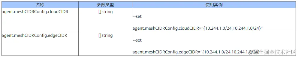 agent.cloudCIDR="{10.244.1.0/24,10.244.1.0/24}",agent.edgeCIDR="{10.244.5.0/24,10.244.6.0/24}"