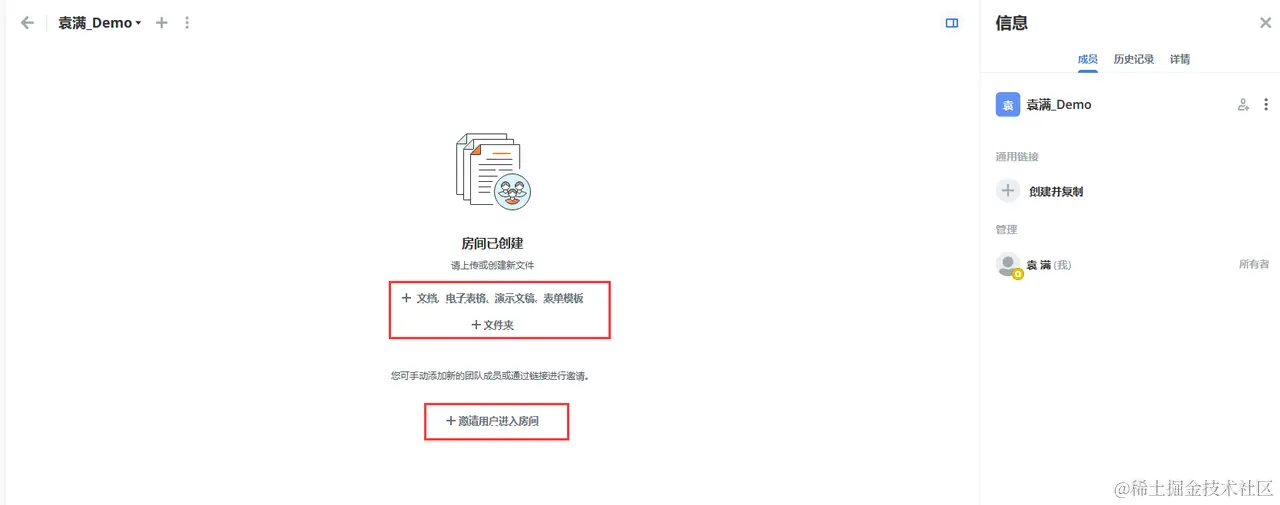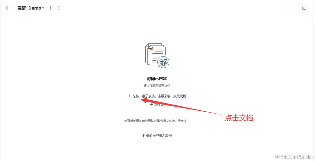 创建成功后就可以创建文档 或者 邀请用户加入了: