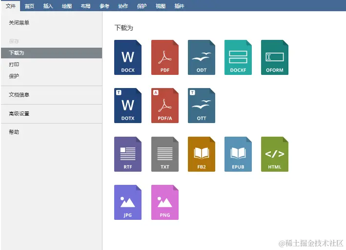 文件类型种类丰富,ONLYOFFICE 支持多种文件类型下载保存,如:DOCX、PDF、ODT、DOCXF、DOTX、OTT、RTF、TXT、FB2、EPUB、JPG、PNG等等,以满足了不同用户的需求。
