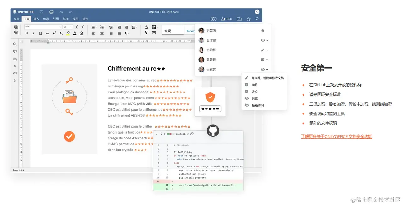 从GitHub上拷贝源代码部署在自己的服务器上,从而保证数据的安全。并且ONLYOFFICE支持三级加密(静态加密、传输中加密、端到端加密)、安全访问和监测工具和额外的文件权限进一步为数据的安全性保驾护航。