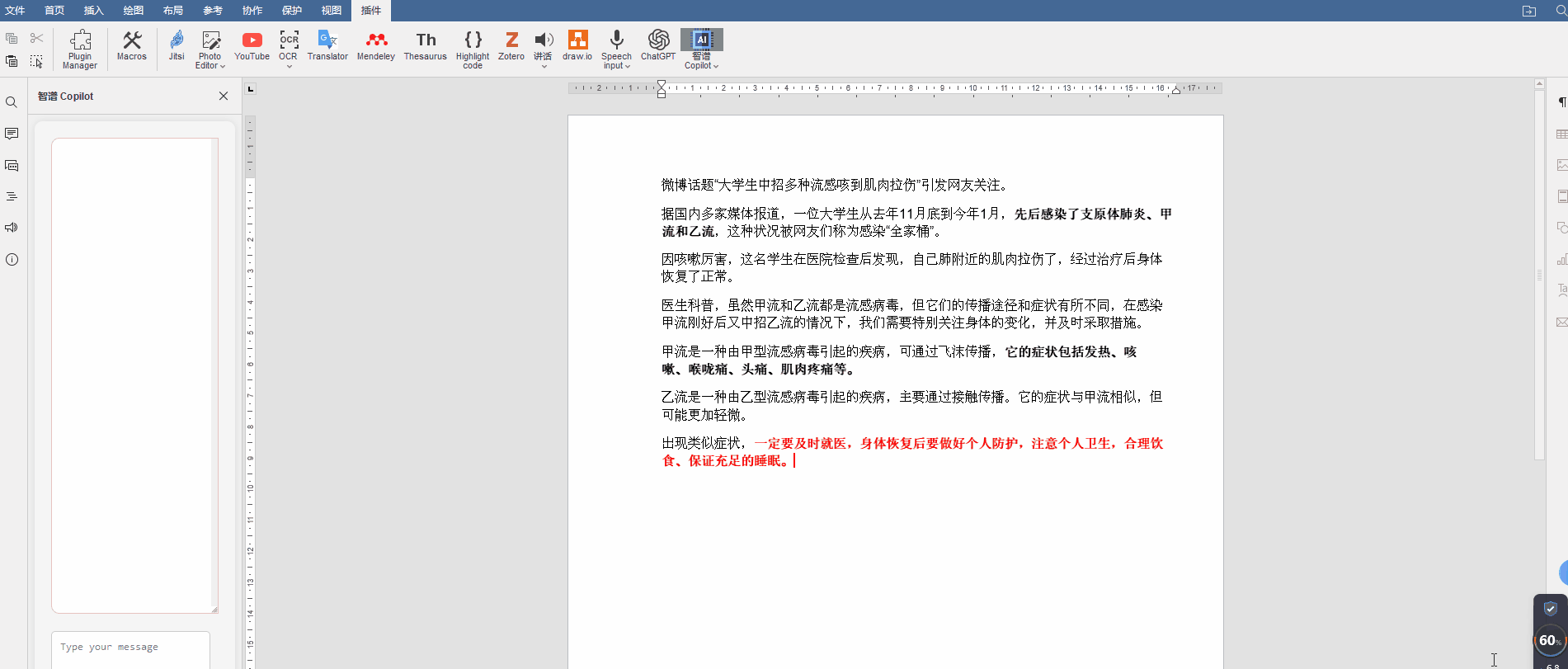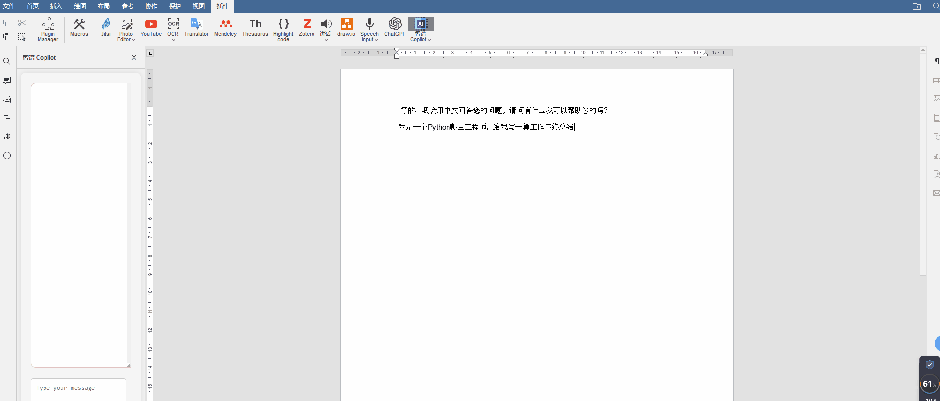 1、文本生成测试,让AI插件给我写一个工作年终总结试试: