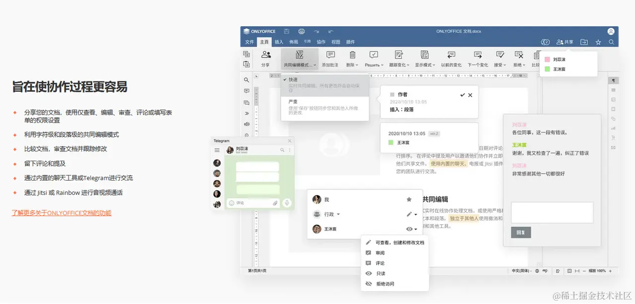 ONLYOFFICE内置了聊天工具,团队伙伴进行实时交流;标记共同作者并为其留下评论: