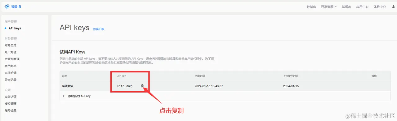 4、智谱AI地址:open.bigmodel.cn/overview,注册后在后台复制API Key: