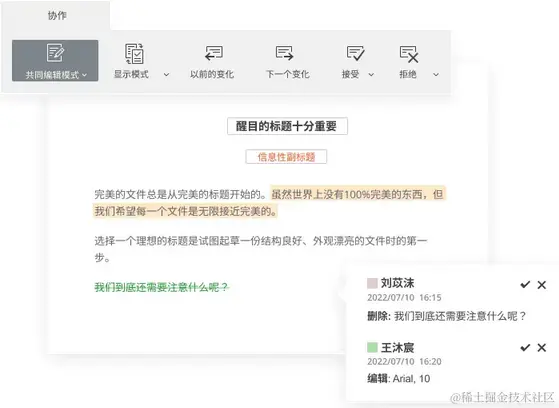 支持通过审阅模式跟踪协作者的更改,并且可以选择接受或者拒绝变更: