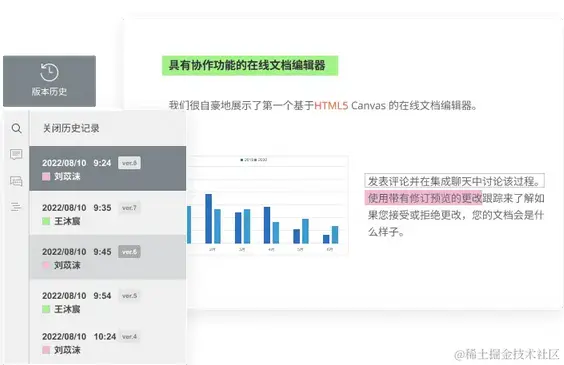 支持查看跟踪文档中的所有更改历史记录,可以查看是谁在何时做出了更改,并且可以恢复到以前版本: