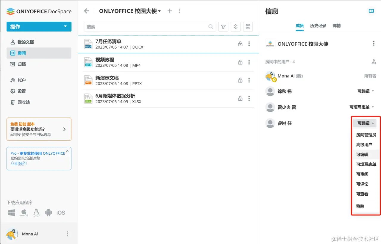 ONLYOFFICE多人协同办公可以给小组中的每个角色设置不同的权限:房间管理员、高级用户、可编辑、可填写表单、可审阅、可评论、可查看、移除等等: