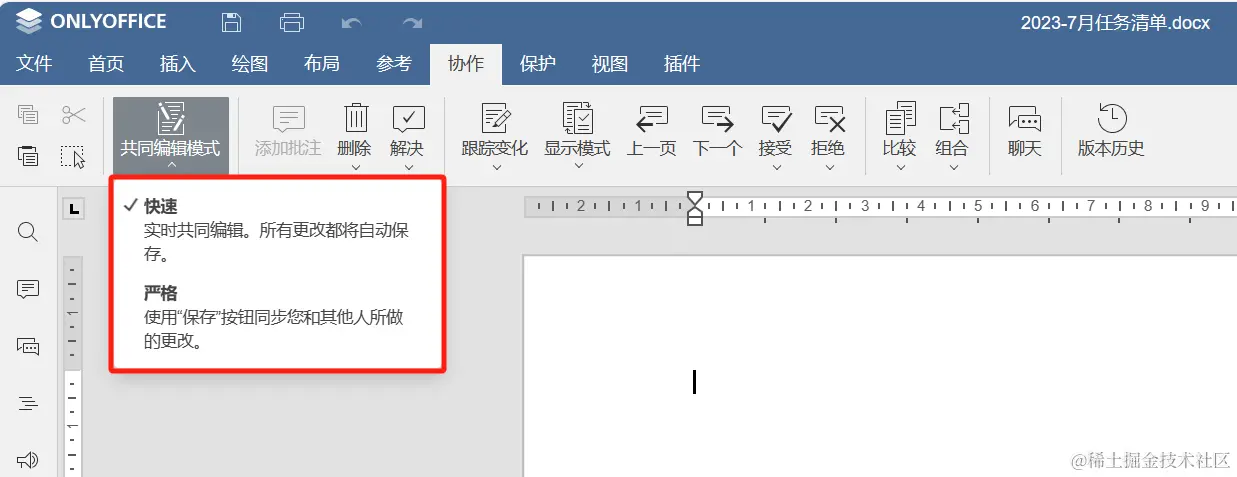 可选择两种协同编辑模式来对文栏进行协作处理: