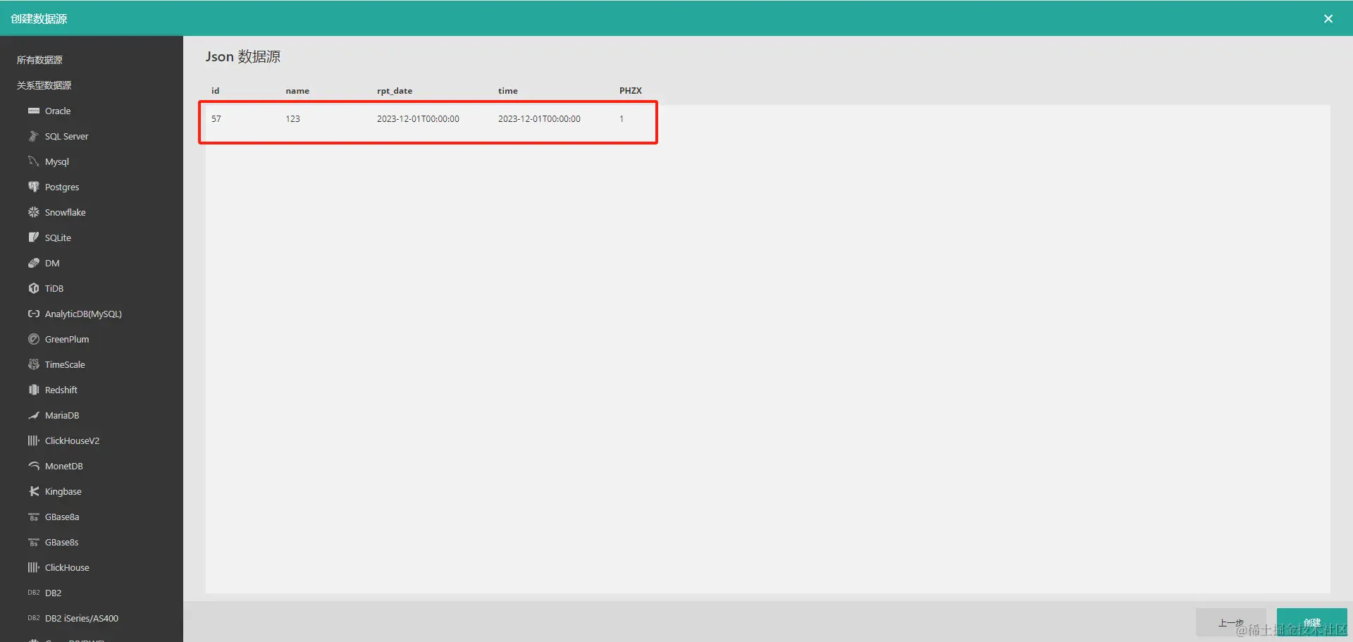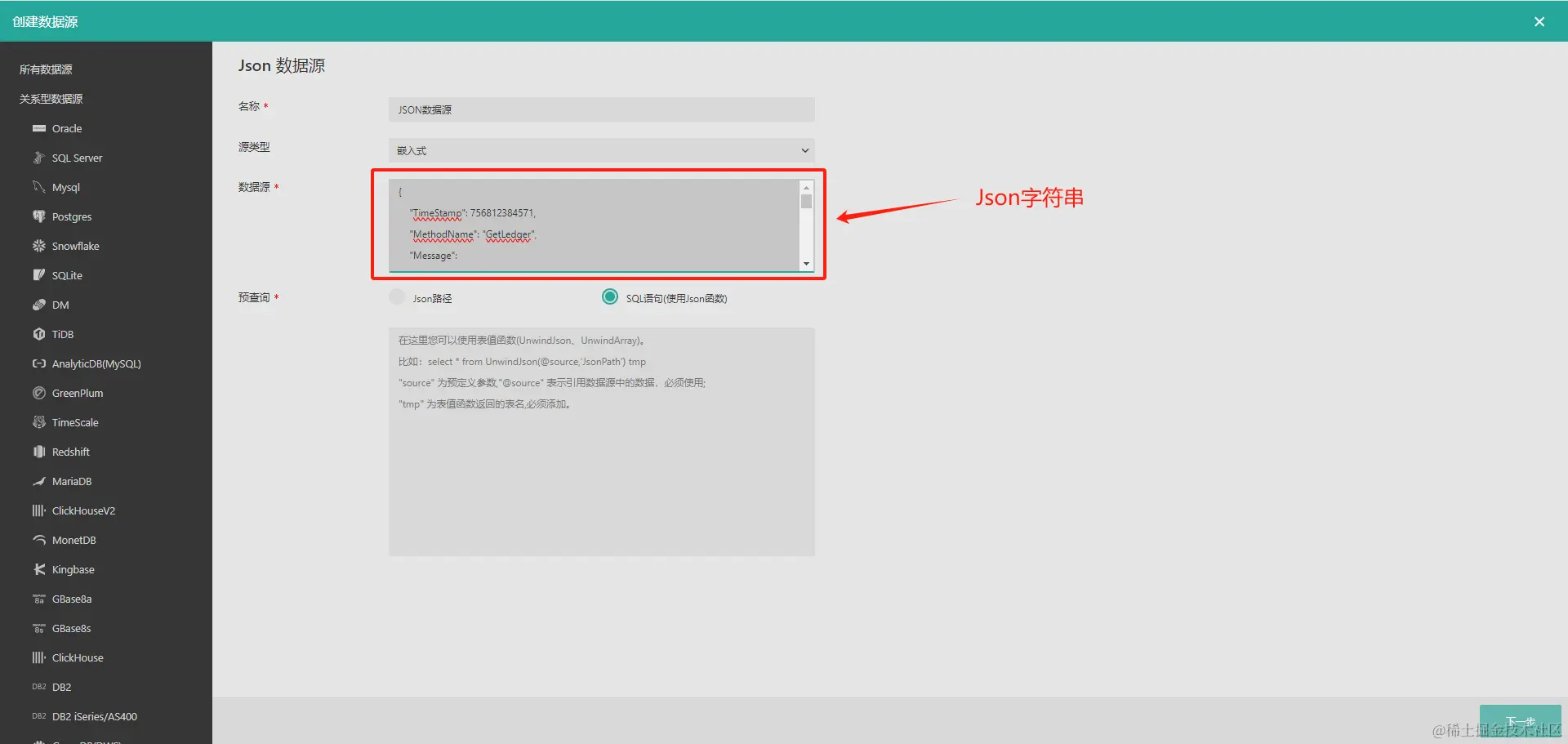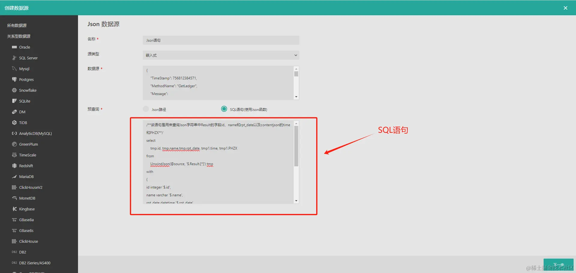 填写完数据源之后,下一步时对数据进行SQL预查询,保证JSON字符串中的数据可以被查询出来。