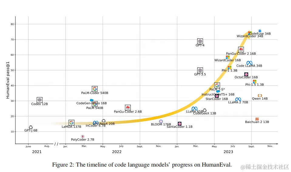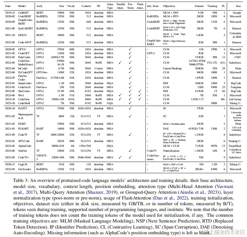 随着开创性的基准HumanEval,Chen等人(2021)用Codex启动了LLM时代,这是在100B额外代码token上预训练的GPT-3,是最早的数十亿个代码模型之一。在他们的工作之后,其他研究人员也将他们的LLM专门研究代码处理,并进行了额外的预训练。Chowdhery等人(2022年)在7.8B额外代码token上训练PaLM以获得PaLM-Coder,在HumanEval和MBPP(表1)上取得了新的最先进的表现,这些技术后来才被其继任者PaLM 2-S*打破,PaLM 2的最小版本在未披露的代码量上进一步训练。同样,Lewkowycz等人(2022年)在arXiv论文和数学内容的38.5Btoken上训练PaLM,而Rozière等人(2023年)在超过500B代码token上训练LLaMA 2以获取Code LLaMA,其在HumanEval上的性能超过了除GPT-4之外的所有先前的LLMs(表1)。Liu等人(2023)通过多任务微调(MFT)进一步训练Code LLaMA,引入CodeFuse-CodeLLaMA,达到74.4 pass@1,甚至超过了OpenAI发表的GPT-4。 虽然几乎所有这些模型都是经过CLM预训练的transformer解码器,但正如论文在前文中提到的,在此过程中已经引入了一些架构修改。所有这些模型都使用了预范数,GPT-J引入了并行注意,后来被PaLM、GPTNeoX和Phi-1.5所采用。PaLM将MQA和RoPE引入LLM中,RoPE现在被大多数语言模型使用,包括GPT-NeoX、两代LLaMA、Qwen和baichuan 2 7B版。而BLOOM和13B版的baichuann 2则采用ALiBi进行位置嵌入,而LLaMA 2和Code LLaMA则采用GQA代替MHA或MQA。在后文中,论文展示了专门对代码进行预训练的专门模型也密切跟踪了这些工作进步。