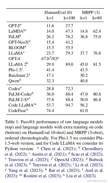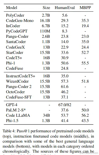 大型语言模型通常按照缩放定律在数万亿标记上进行预训练,如此数量的文本数据通常是一个不同的组合,由不可忽略的部分代码组成。例如,Pile包括从GitHub 800GB原始数据集中抓取的95GB代码,而多语言预训练数据集ROOTS在其1.6TB数据中也包含跨越13种编程语言的163GB的代码。作为两个最大的开源预训练数据集,它们支持了许多具有编码能力的语言模型。例如,Chen等人(2021)报道了GPT-J在HumanEval上的优秀表现,而Scao等人(2022)报道了GPT-NeoX和BLOOM的在HumanEval上类似结果。LLaMA的预训练数据集包括来自GitHub的328GB代码,在HumanEval上获得了23.7的 pass@1表现,其后继者LLaMA 2(获得了更高的分数,为29.9分。 另一方面,闭源模型总体上表现得更好。LaMDA和PaLM,其预训练数据集分别包含12.5%和5%的代码,达到14.0和26.2 pass@1表现,而GPT-4的记录为惊人的67.0(Bubeck等人报告的早期版本(2023)为82),直到最近都一直高于任何预训练或为代码教学的专门模型。 最近,总体趋势是根据修正后的尺度法则,用更大的数据集训练更小的模型。例如,baichuan2是在2.6T token上训练的13B模型,而Qwen是在3Ttoken上训练的14B模型。他们在HumanEval上分别达到17.1和32.3 pass@1。事实证明模型小至1.3B可以获得的编码能力相当于更大的模型,同时保持合理的性能一般文本处理,甚至取得一些应急能力如链推理。他们的模型Phi-1.5在ChatGPT生成的教科书数据的21B标记和从堆栈溢出和细化网络过滤后的网络数据的100B标记上进行训练,并在HumanEval上获得41.4 pass@1的性能。这些模型的确切性能如表1所示。