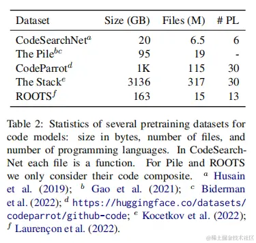 虽然用于预训练语言模型的文本数据通常是从网络中获取的,但必须经过细致的、经常是积极的预处理,代码数据自然是来自GitHub存储库的整个公共文档。更好的是,它们提供了现成的质量指标,如star或fork的数量(尽管Allal等人(2023年)表明,star数与下游性能的相关性较差)。因此,引入了许多大规模的代码预训练数据集,包括CodeSearchNet、CodeParrot和the Stack,分别总计20GB、50GB和3TB的代码文档(表2)。