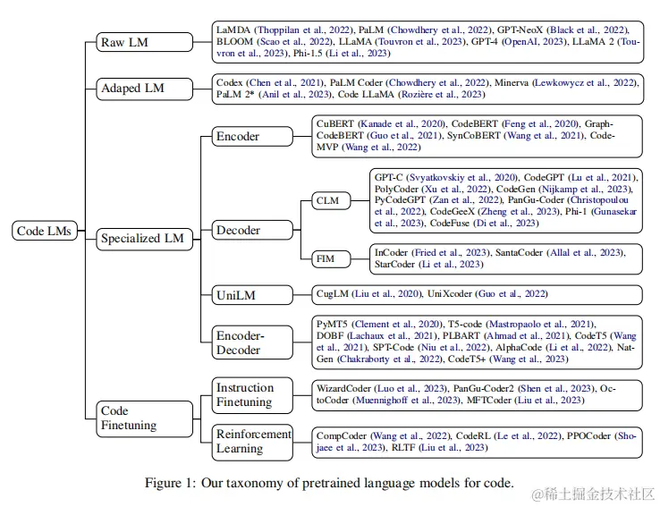 在这项工作中,论文系统地回顾了在代码处理方面的最新进展,包括50个+模型,30个+评估任务和500个相关工作。论文将代码处理模型分解为由GPT家族表示的通用语言模型和专门预训练的代码模型,通常具有定制的目标。论文讨论了这些模型之间的关系和差异,并强调了代码建模从统计模型和rnn到预训练的transformer和LLM的历史转变,这与NLP所采取的过程完全相同。还讨论了特定于代码的特性,如AST、CFG和单元测试,以及它们在训练代码语言模型中的应用,并确定了该领域的关键挑战和潜在的未来方向。