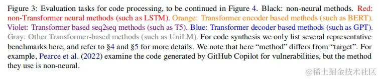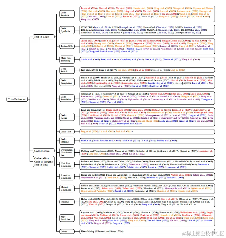 在过去的十年里,软件工程界提出了各种评估任务来评估代码模型。CodeXGLUE将大多数此类任务合并整合为一个单一的基准测试,包括代码理解任务,如克隆检测、缺陷检测和序列到序列的生成任务,如代码修复、代码翻译、程序合成和代码摘要。然而,在Chen等人(2021)引入HumanEval和Codex之后,text-to-code的合成成为NLP社区关注的焦点,并已成为评估LLM的标准任务(图2)。因此,论文首先简要介绍了每一个传统任务以及预训练语言模型的应用,并在图3、4中提供了每个任务的相关工作的全面列表。然后,回顾了评估指标,并更详细地研究了程序合成。最后,论文还讨论了存储库级评估的最新趋势。在附录A中,列出了每个下游任务的基准测试。