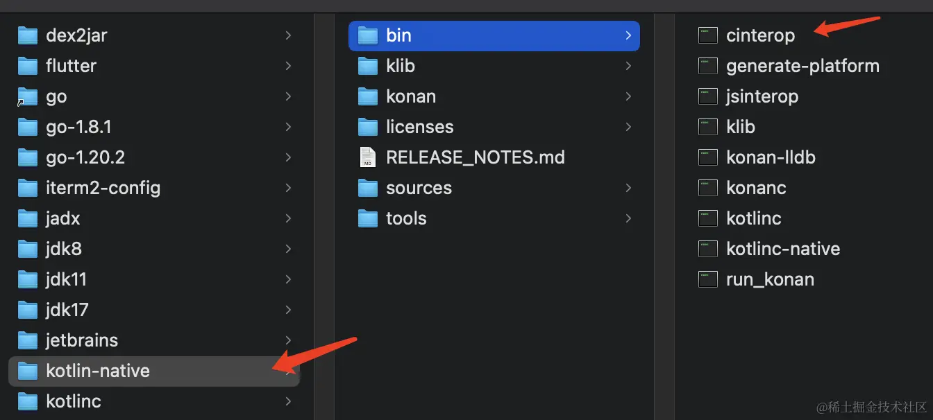 Kotlin Native 内部使用 cinterop 来对 Apple Framework 进行扫描,根据其头文件(.h)获取可以调用的类、方法、变量、常量以及他们的类型,最终生成 klib 文件。而 klib 文件中含着针对不同 CPU 架构所编译的二进制文件,以及可供 Kotlin Native 调用的 knm 文件, knm 文件类似 Jar 包中的 。class 文件,是被编译后的 Kotlin 代码,内部将 cinterop 扫描出来 的 Objective-C 内容转换成了 Kotlin 对应的内容,以便 IDE 可以进行索引,最终在 KMM 模块中使用 Kotlin 代码进行调用。