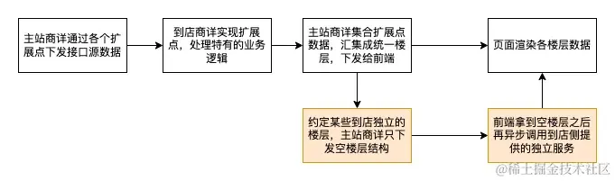 鉴于V1架构开发周期长,依赖方多等原因,到店侧决定将新迭代的某些独立楼层如:附近推荐、附近门店等新建一个服务,由主站商详下发空楼层,具体的楼层数据处理完全交由到店侧。