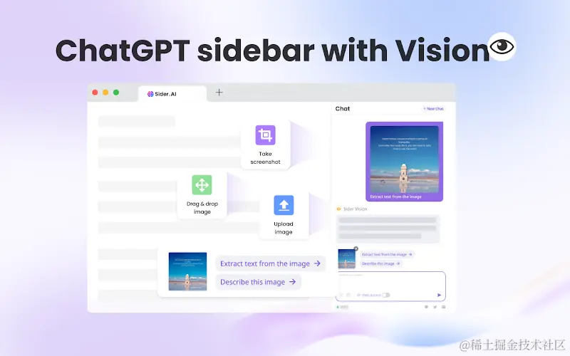Sider 是一个类 ChatGPT 的 AI 助手,你可以在任何标签页上调用ChatGPT,而无需在标签页之间切换,且提供多个 AI 可供切换,包括 ChatGPT 3.5、GPT-4、Claude Instant、Claude 2 和 Google Bard 。