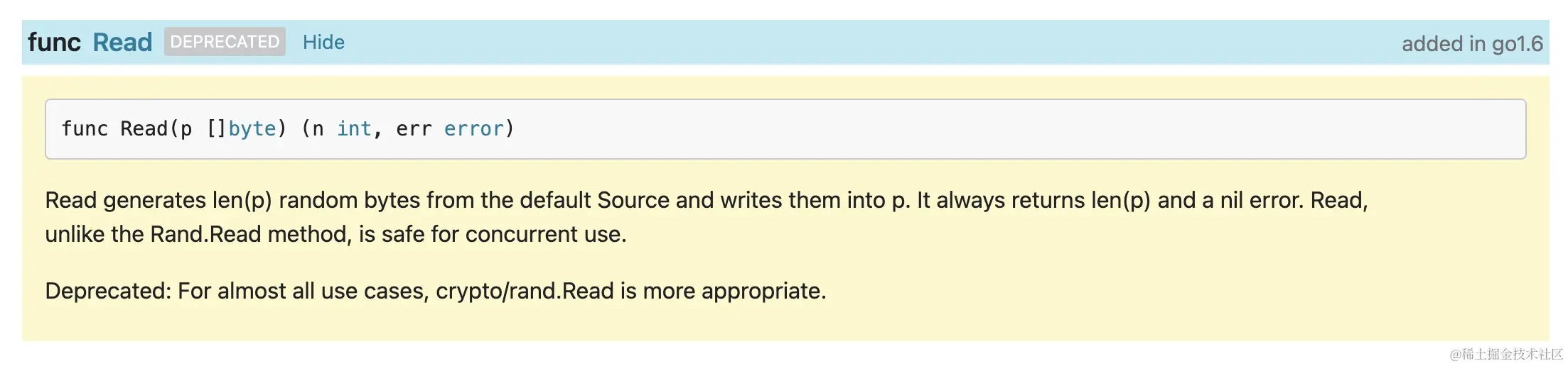 在 math/rand 中存在 Read 函数,他在 v1 版本已经被弃用。