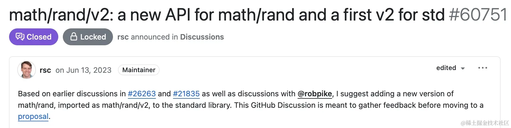 math/rand的老毛病和待提高的地方太多了。例如:过时的生成器、缓慢的算法(性能),以及与crypto/rand.Read的不幸冲突等问题。 - 计划推动标准库的 v2 版本升级。先用 math 试试水,积累经验。例如:解决工具生态的问题(gopls、goimports 等工具对 v2 包的支持)。后续再对风险更高的包(如:sync/v2 或 encoding/json/v2)进行新版本迭代。