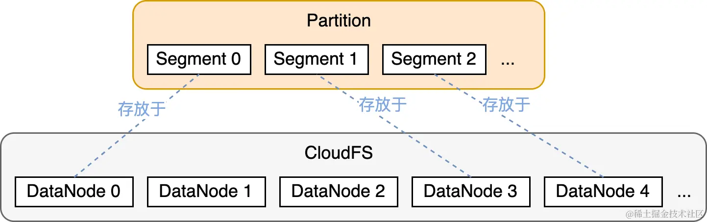 - 每个 Partition 对应分布式存储CloudFS中的一个目录,数据被切分为多个 Segment 文件并存储。