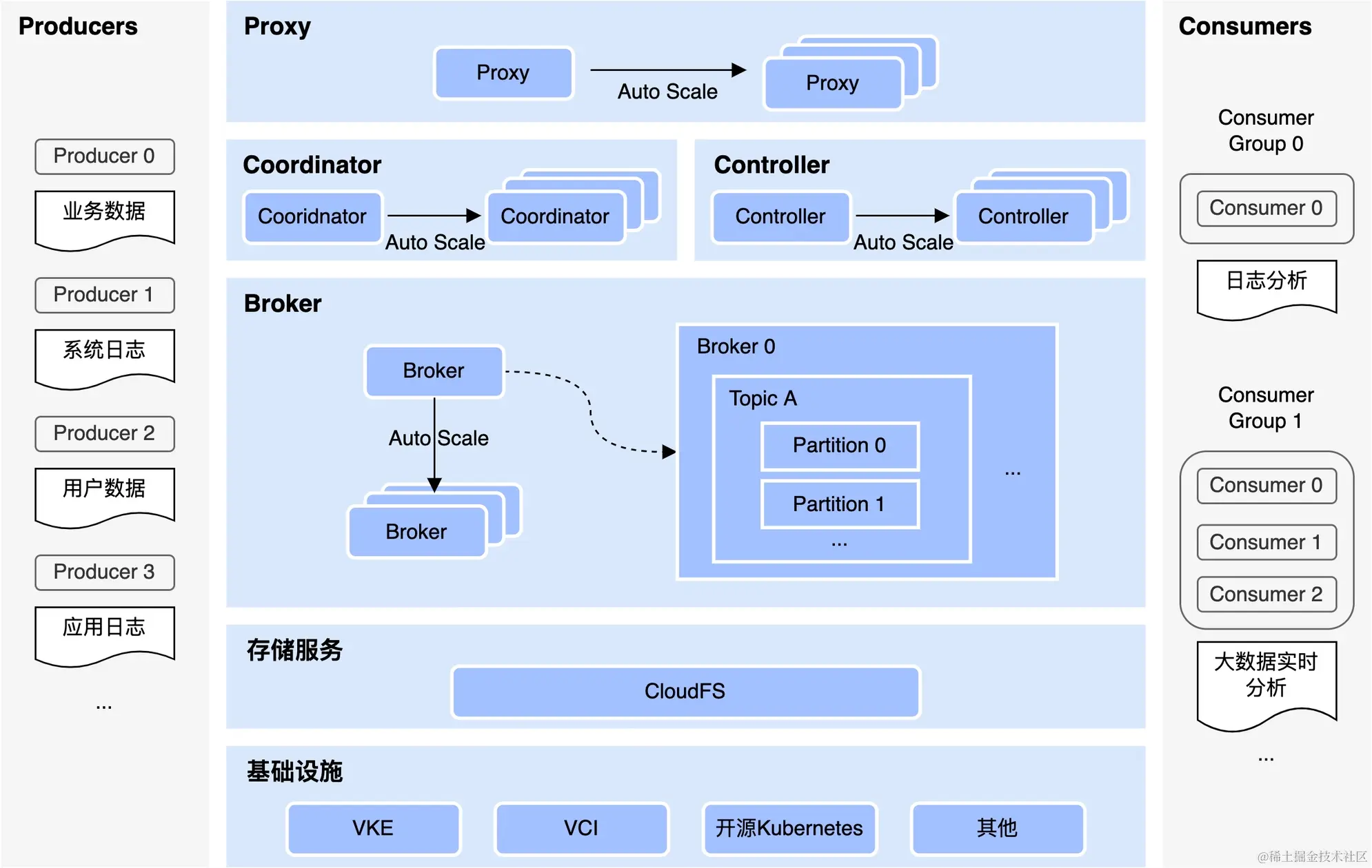 Broker:负责处理来自 Proxy 的 Produce 请求,将数据持久化到分布式存储系统中,同时负责删除过期的数据。