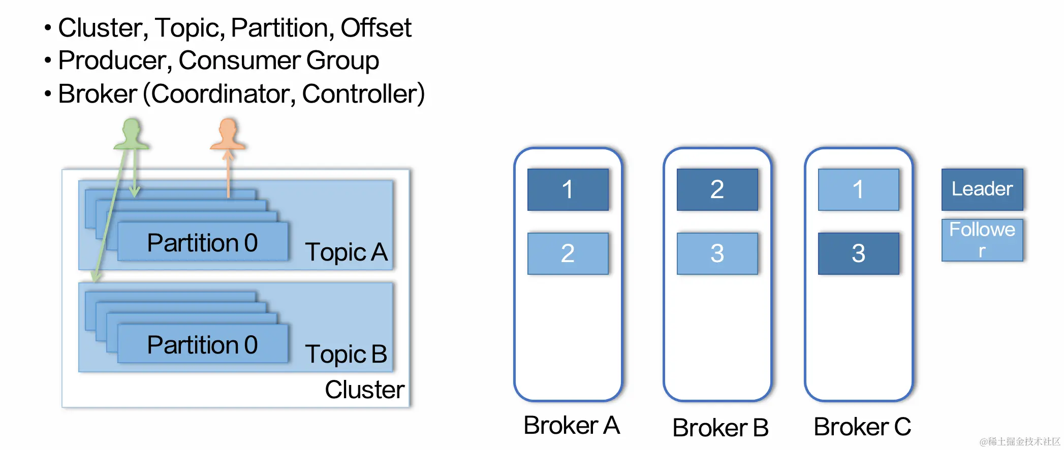 Controller:根据统计信息来对 Partition 进行负载均衡,同时还负责集群管理的任务,如新建 Topic、扩容 Partition 等。