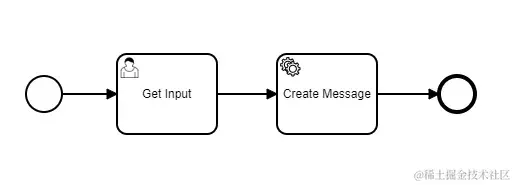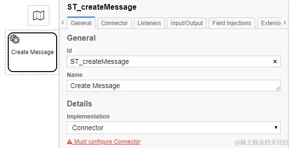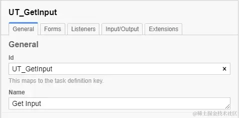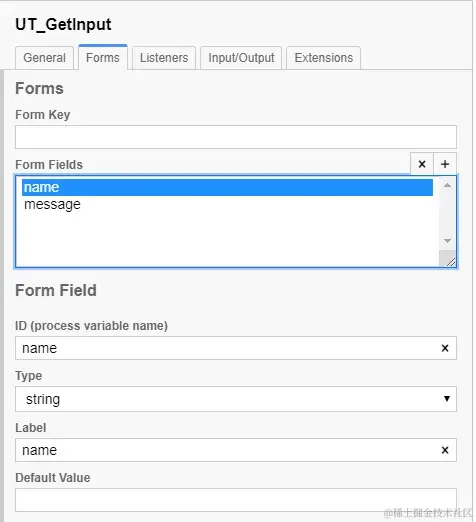 图中带有小人的框称为User Tasks,是执行与用户相关的操作的步骤。如前面部分所述,在工作流程的第一步中,我们将请求用户输入两个输入:姓名和消息。无需添加新任务,更新现有的User Tasks即可解决问题。单击User Tasks,打开属性面板,在打开的面板中定义适合我们案例内容。