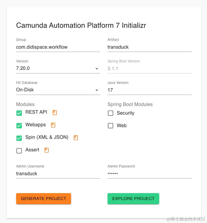 - 使用Camunda提供的项目初始化工具Camunda Automation Platform 7 Initializr