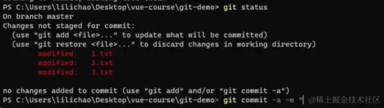git commit -a -m "提交日志" 提交所有已修改的文件(相当于跳过了 add 步骤,但是未跟踪的不会直接提交)