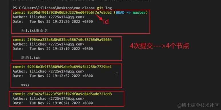 git log查看所有 commit 记录,每个记录为一个节点,都有一个 commit id。