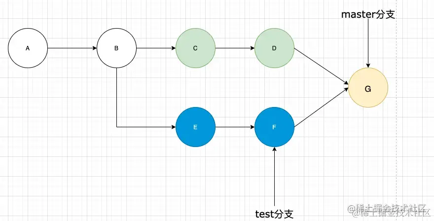 (1)git merge test 生成了一个新的提交点 G,merge 命令把两个分支的最新快照(F、E 和 D、C)以及二者最近的共同祖先(B)进行三方合并,合并的结果是生成一个新的快照 G(并提交)。