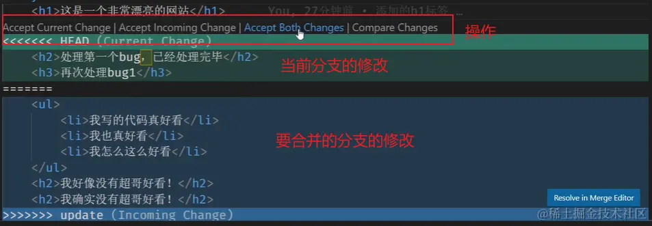 分支之间存在冲突时,需要手动处理冲突:保留当前 / 保留要合并的分支 / 都保留