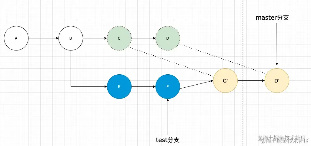 - 然后把提取到的 C, D 接到 F 后面,在这个过程当中,会删除原来的 C, D commit 记录,生成新的 C', D',虽然C', D'和原来的C, D commit的内容是一样的,但是 commit id 是不同的。