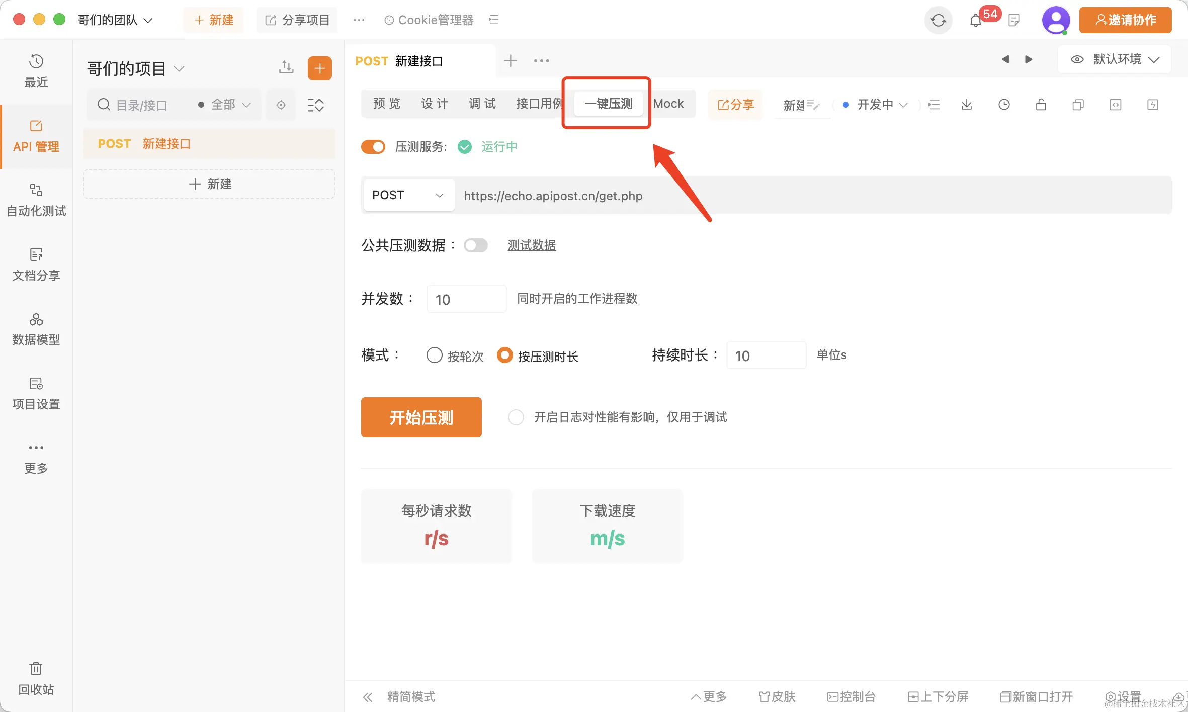 接口调试完成后可以在一键压测页面进行并发测试,看看接口在高并发情况下的运行情况