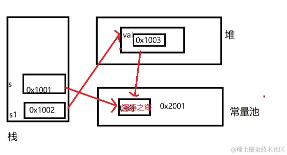 这种方式它首先会先从常量池查看是否有"涛涛之海" 这个数据空间,如果有就直接指向,如果没有就创建一个”涛涛之海“这个数据空间然后指向它。注意s最终指向的是常量池的空间地址。