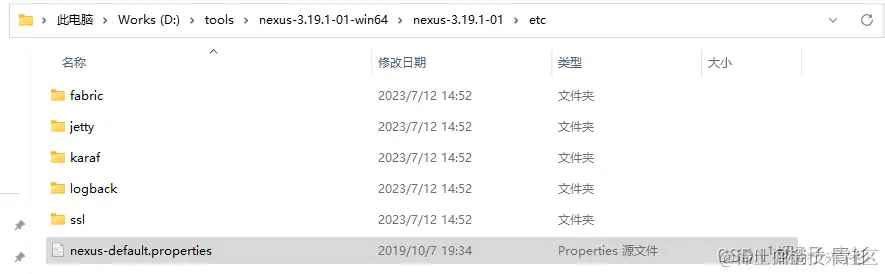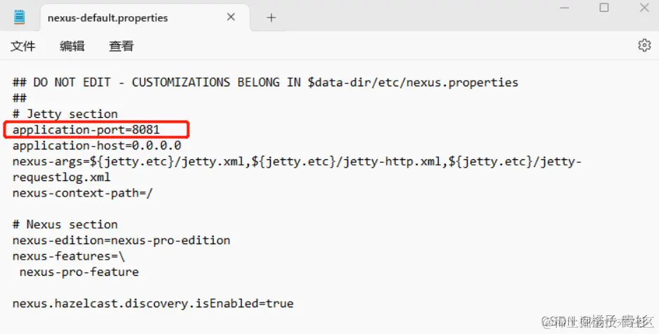 如果需要修改端口号,可在配置文件(nexus-default.properties)中修改(示例:nexus-3.19.1-01-win64\nexus-3.19.1-01\etc):