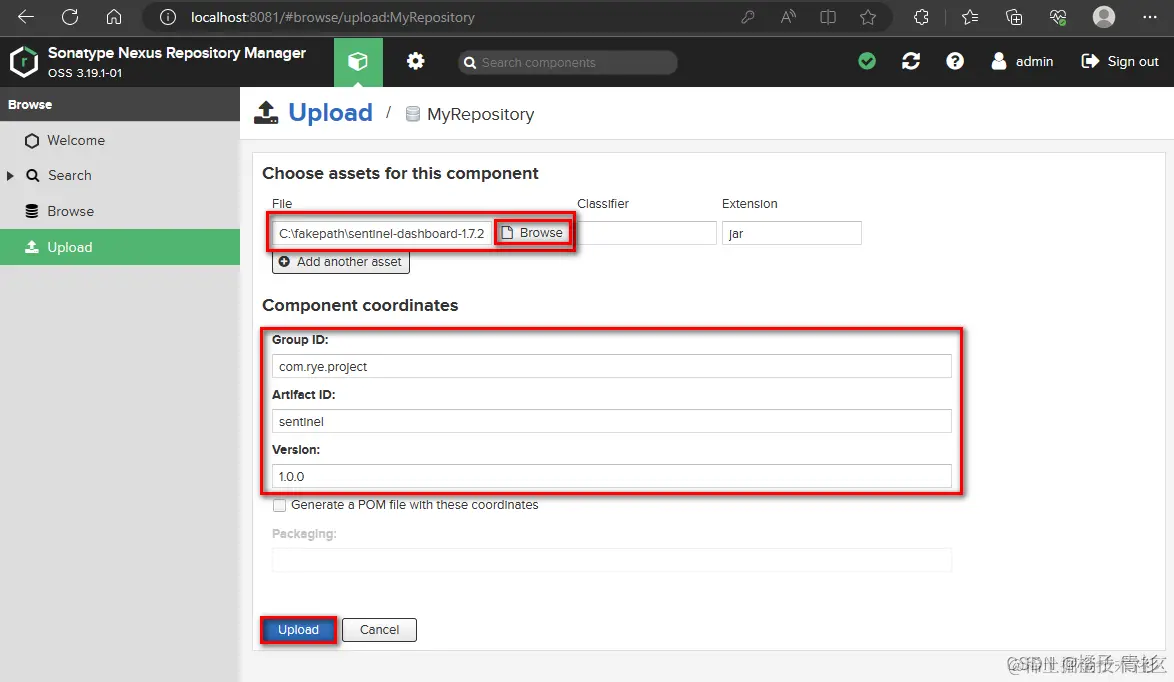 选择jar包,并填写相应信息,然后进行上传: