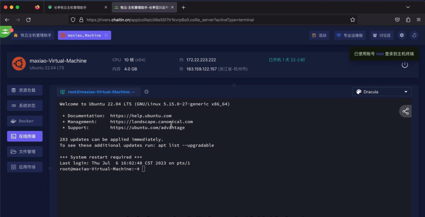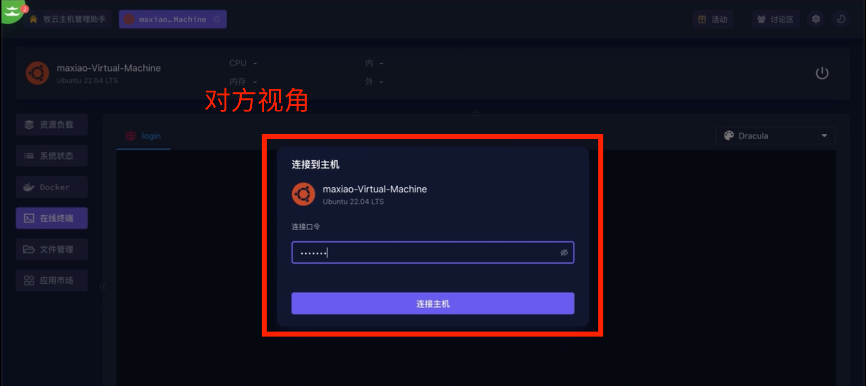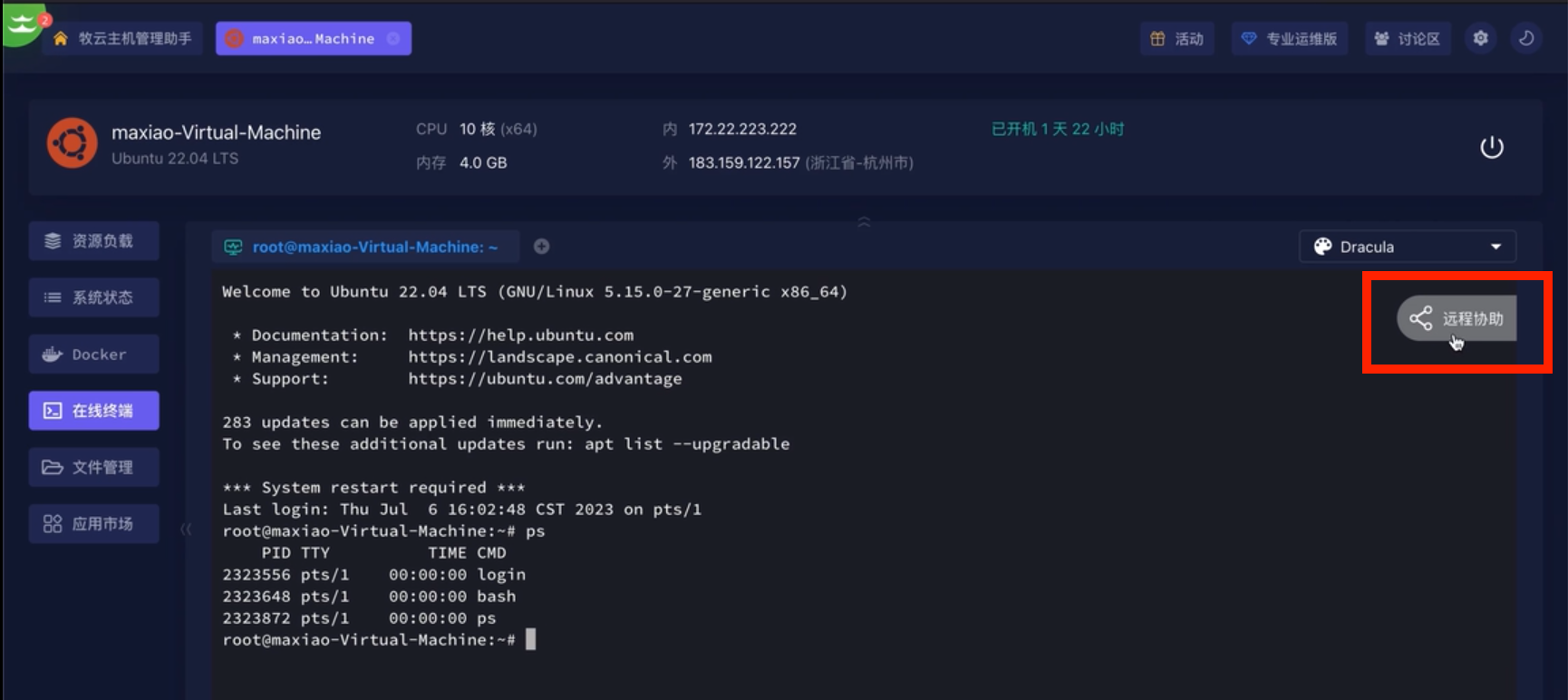 💻首先打开牧云主机管理助手,选择需要进行远控的服务器,打开对应的web terminal。