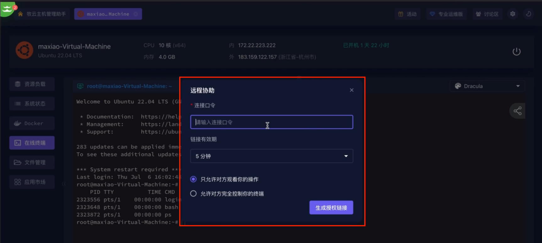 ✉️最后将生成的临时授权链接复制下来,发给对方。对方只需要将链接粘贴进浏览器,输入连接口令,就可以远程控制你的服务器,帮助你解决问题了!