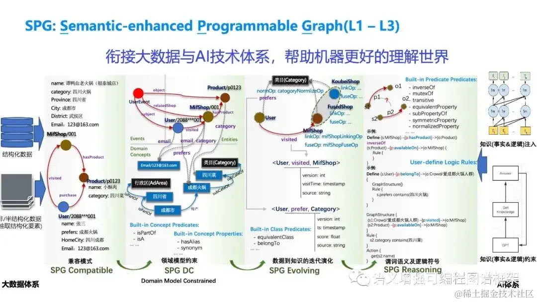 - 知识间依赖性:通过SPG Reasoning 谓词/ 逻辑体系定义知识之间的依赖,并提供可编程的推理表示。