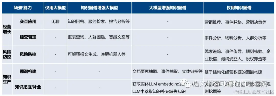 - 知识挖掘:企业促进增长和把控风险,不断提升主体要素、跨主体关系的长尾覆盖。表1 中列举了不同分类下LLM、KG 及LLM与KG 相互增强可能的落地应用。这些应用可以帮助企业在商户经营和风控领域中获得更好的效果和成果。