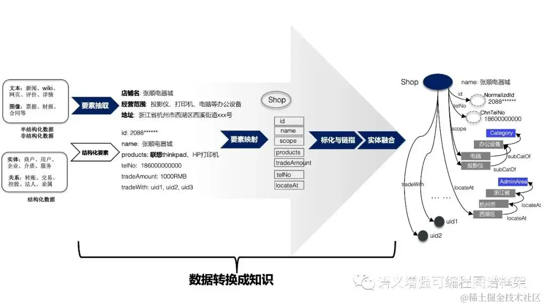 - 知识构建:将外部非/ 半结构化、结构化数据转换成领域知识;
