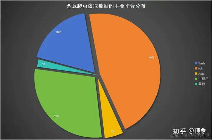H5在给用户带来便利体验的同时,也让企业面临链接伪造、页面篡改、信息泄露、账号被破解、恶意劫持、薅羊毛等各类业务风险。顶象防御云业务安全情报中心的一项数据显示,在恶意爬虫盗取数据攻击中,H5页面遭遇攻击占到总攻击量的46%,其次是小程序29%,然后是Web端占18%;App端占5%,其他平台占2%。
