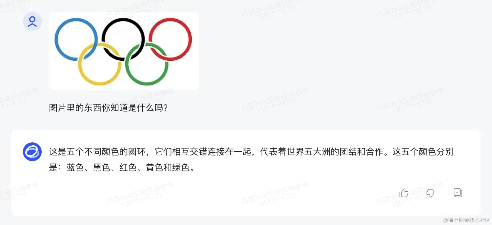 为了测试它到底是不是真的理解图片里的含义,我上传了五环的图片,它成功的告诉我这个是五环,代表世界五大洲的团结和合作,赞!