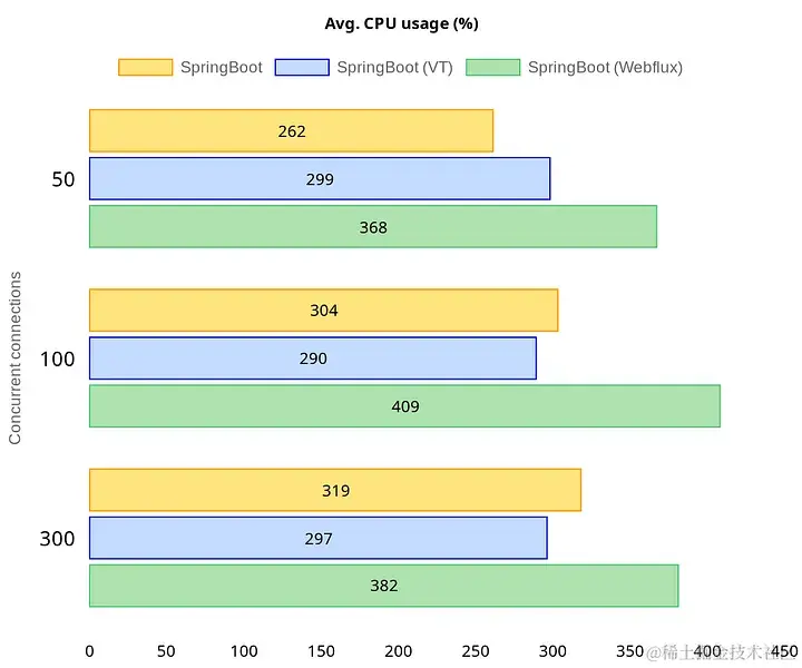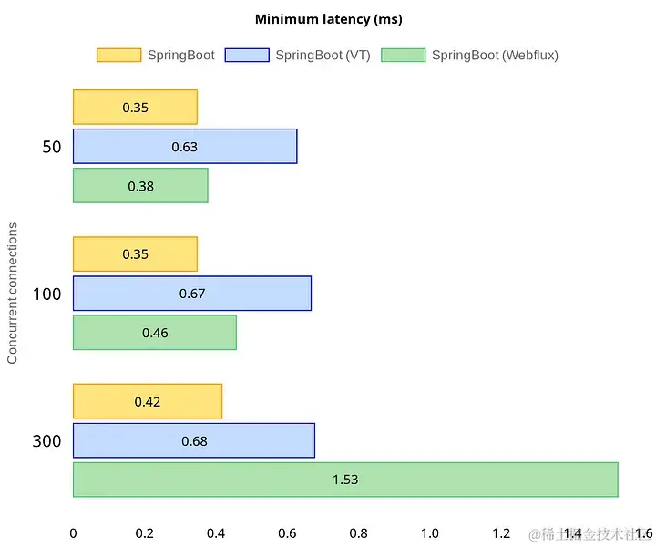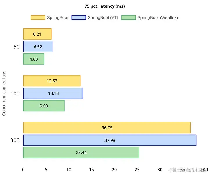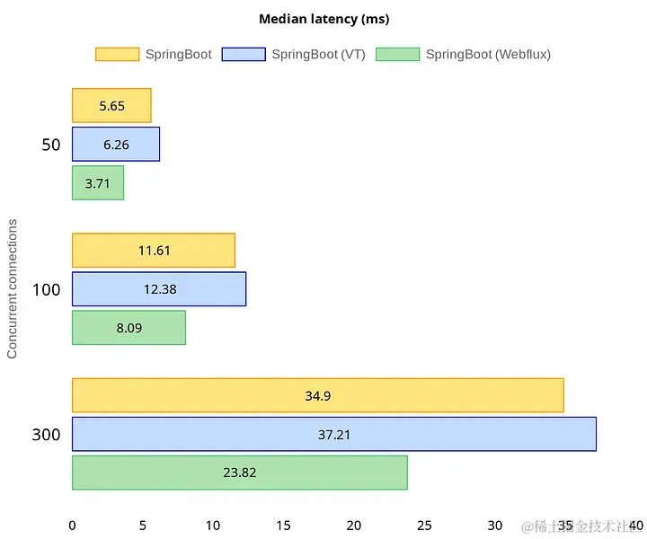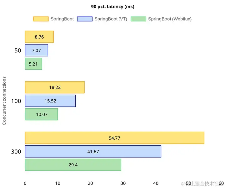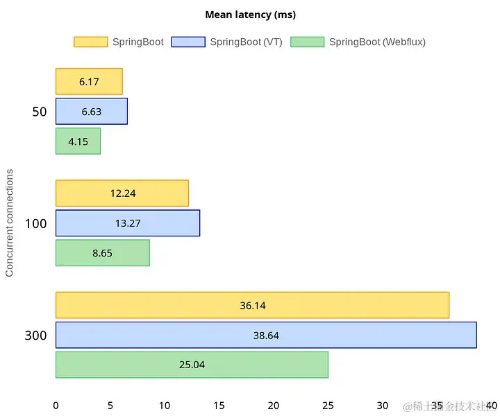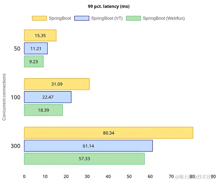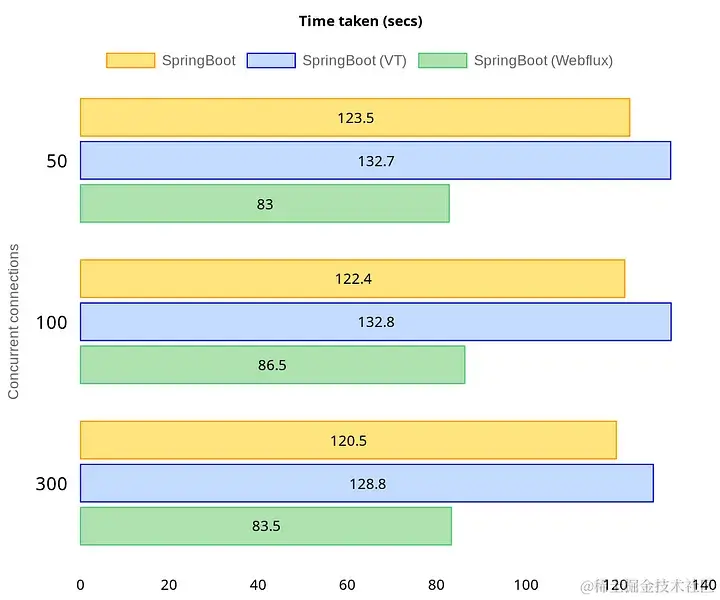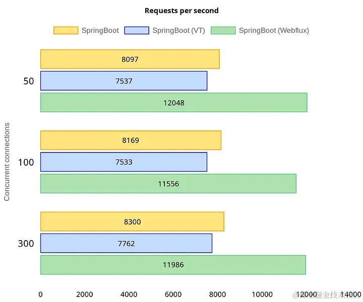 在这个测试案例中使用了MySQL驱动,虚拟线程的实现方式性能最差,WebFlux依然保持领先。所以,主要原因在于这个MySQL的驱动对虚拟线程不友好。如果涉及到数据库访问的情况下,需要寻找对虚拟线程支持最佳的驱动程序。另外,该测试使用的是Java 20和Spring Boot 3.1。对于Java 21和Spring Boot 3.2建议读者在使用的时候自行评估。